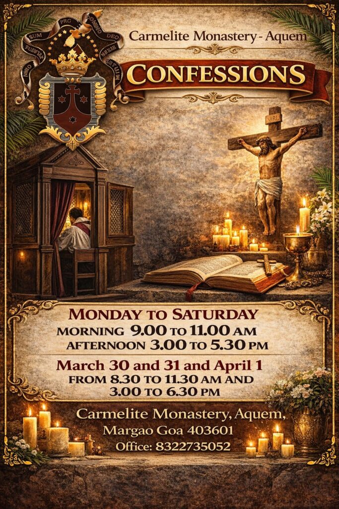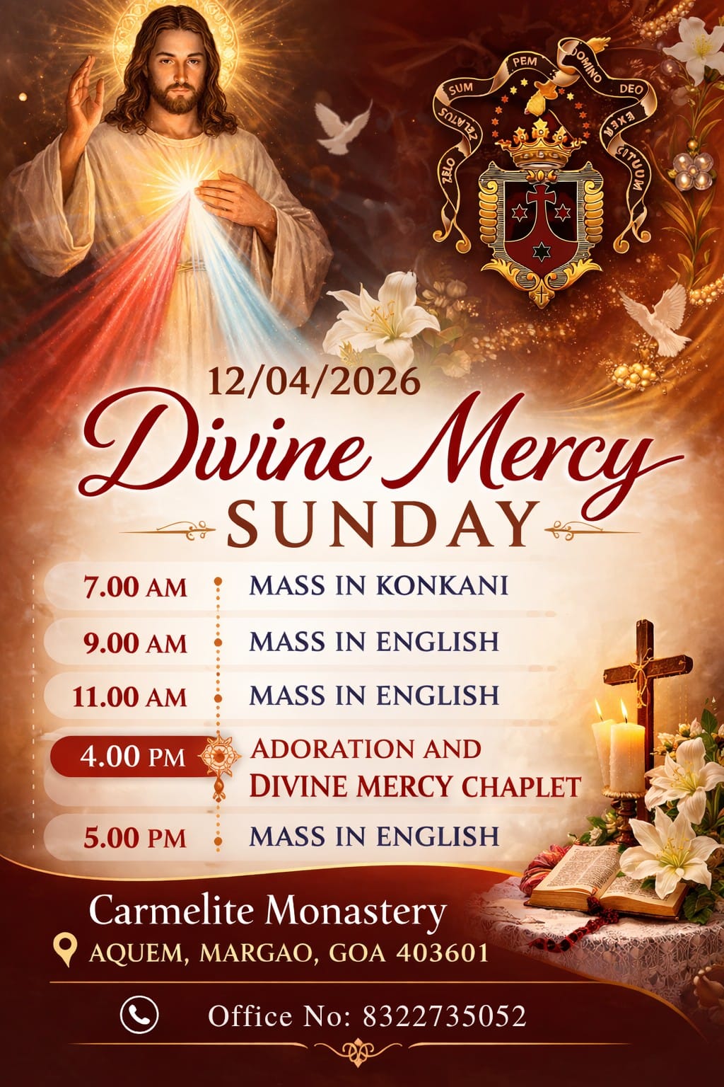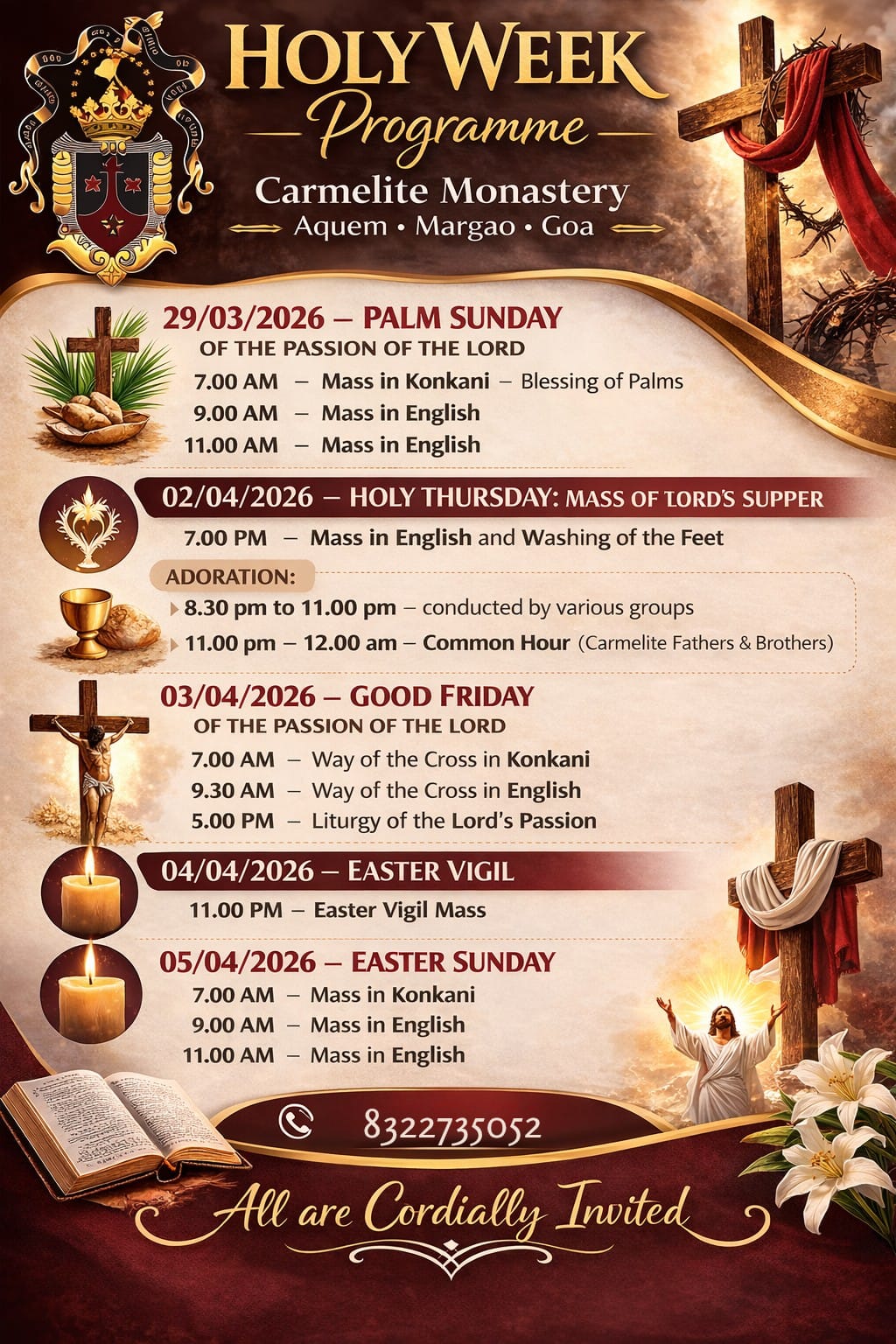 - The 40 Hours of Eucharistic Adorationby adminThe 40 Hours of Eucharistic Adoration was prayerfully inaugurated at the Carmelite Monastery Margao on 26th February at 5:30 a.m., drawing the faithful into a deep encounter with the Lord in the Blessed Sacrament. The solemn opening began with the Exposition of the Eucharist, followed by a reverent procession within… Read more: The 40 Hours of Eucharistic Adoration
